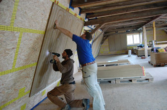 Derzeit wird der farbige Lehm-Edelputz abgeschlossen.
