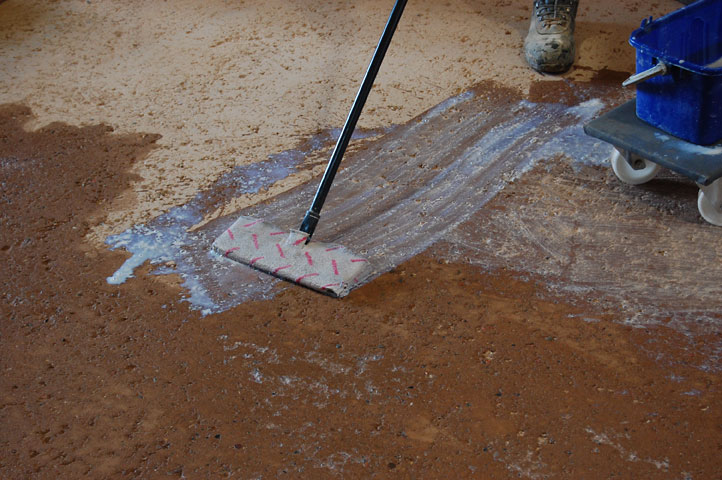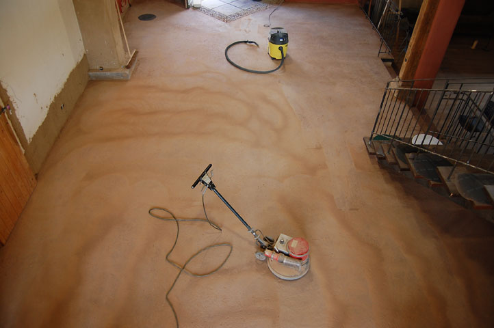 In einer 12 cm dicken Schicht aus Stampflehm sind Heizleitungen integriert. Nach dem Einbau, der Verdichtung mit schweren Rüttelplatten und der Trocknung wurde der Boden geschliffen, mit Canaubawachs vorbehandelt, gespachtelt und gewachst.